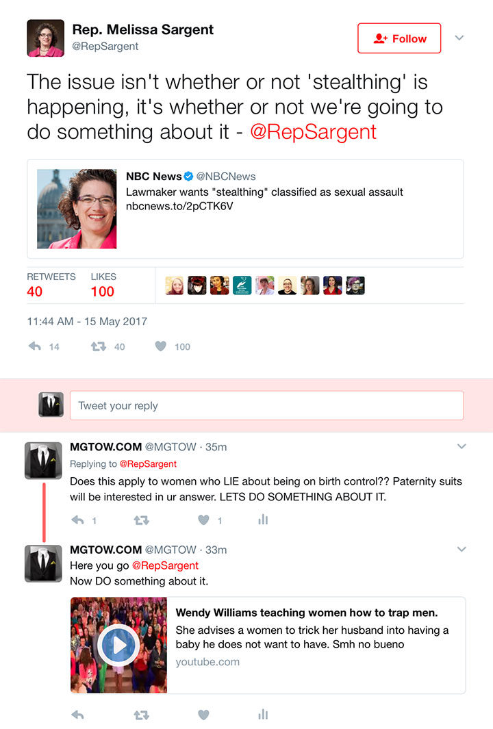 I wanted to know what it would be like to be an MRA (Men’s Rights Activist) for a day. So took to twitter and contacted @Rep. Melissa Sargent!
