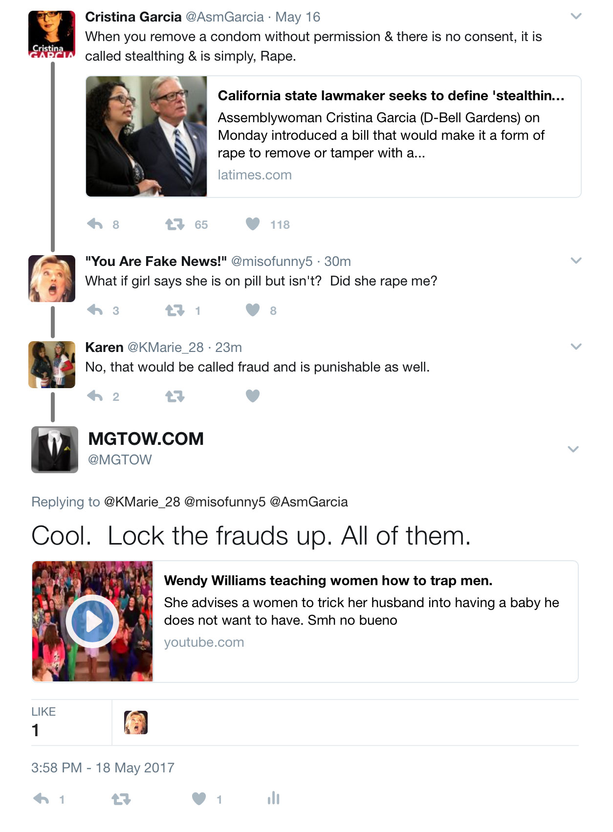 But politically, KM’s approach is perfect. There are still men out there that want to have sex and need some kind of protection from these vile and hypocritical c~~~s. And I would vote for any law that makes it illegal for women to trap men into fatherhood.