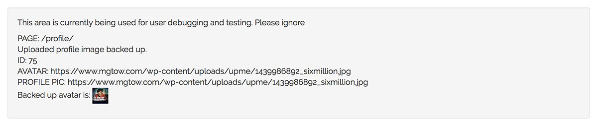 I just did it for Russky, Hitman (I cropped his Gozilla pic manually) , MGTOW pirate, Rennie, Lucifer, Cap, and a s~~~load more…. and I just noticed iLearn uploaded his while we were testing. Then he uploaded another one which overwrote it – so it’s working.