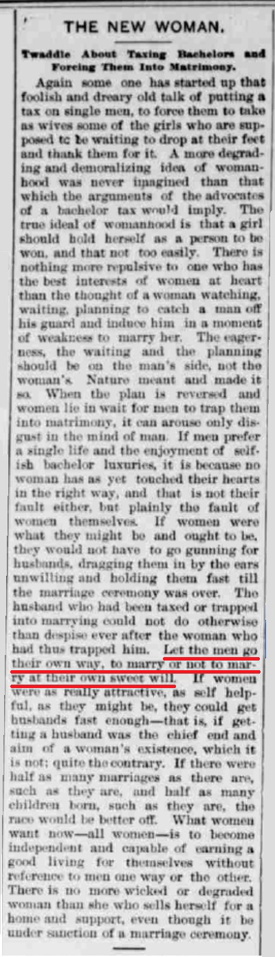 In a printed piece c.1897 (118 years ago) called “The New Woman”….. there is talk about this exact topic. Clipping attached below. It’s about imposing a bachelor tax on men who have no interest in marrying. More interesting is the use of the nearly exact term/concept of “men going their own way”.