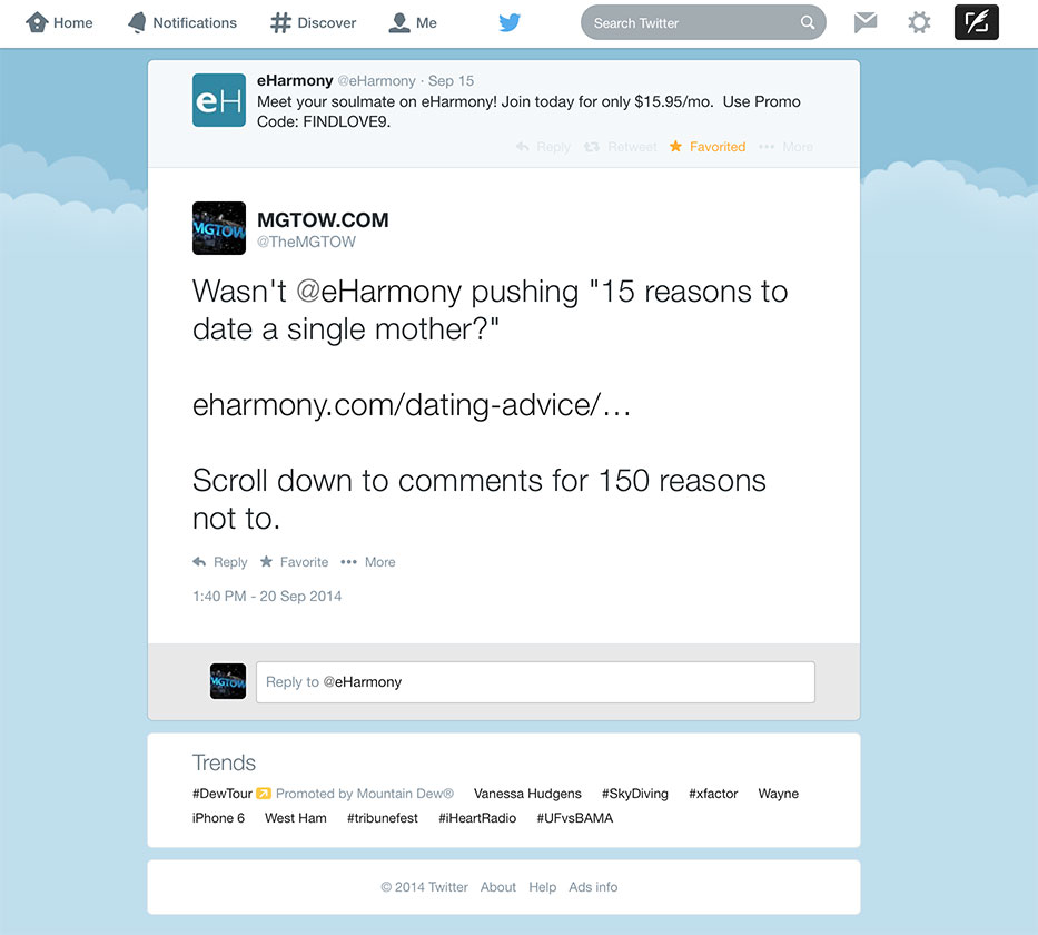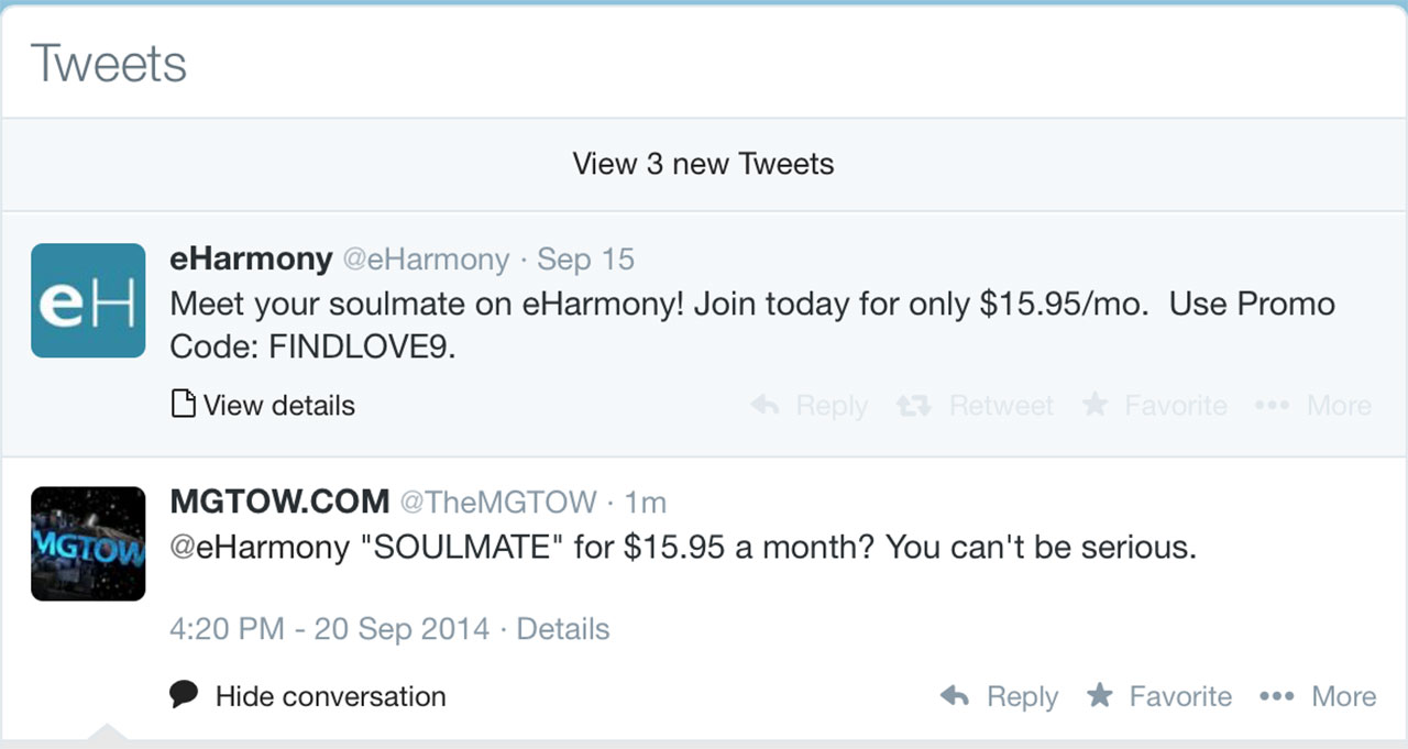 Have any of you ever checked out E-HARMONY? They have the most ridiculous way of “matching” you, through controlled Q&A and carefully controlled responses. Women actually think they can tell if you’re suitable based on how you answer WTF you prefer to drink with your meal. No exaggeration. Check out these little nuggets. E-Harmony was exploding Twitter today (not once but twice) with ads on how you can “meet your soulmate for $15.95 a month”