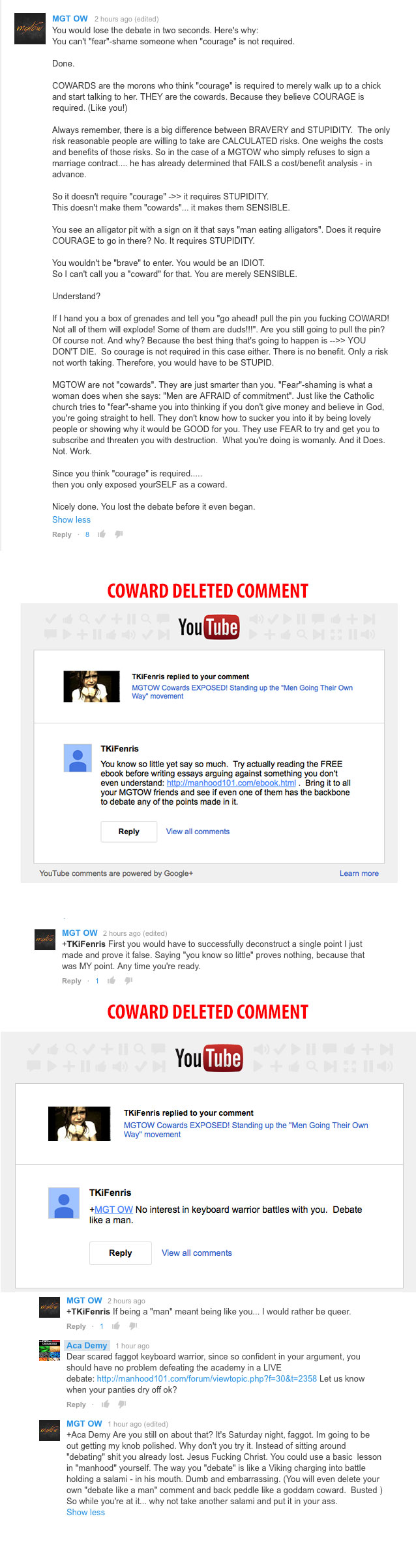 Minutes before this thread was created, we received an email with subject called “Truth Time” with a link to a youtube video . Nothing else. The video is by the “manhood academy” who published it many months ago – shortly after we opened – to serve as a challenge to “coward MGTOW f~~~~~s” (end quote)…. in which a chipmunk voice wanted to engage in an online debate with various MGTOW ….. which was nothing but a ploy and scream for attention motivated by extreme jealousy. Very similar in motivation to the subject above.