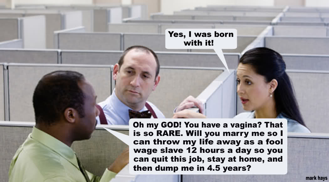 Oh, and remember to get a really large life insurance policy with me (and my vagina) as the beneficiary if you die. Both myself and my vagina need to be taken care of if you are not around to continue being a human wallet.