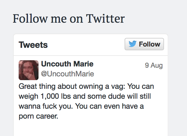 Uncouthmarie: “I love men, and I really love the word “c~~~.” If you research the word’s etymology, there are some remarkable origin stories there. “C~~~” is the equal to “c~~~,” and not divided off with it’s own flowery word. So calling a woman a c~~~ is like calling a woman your equal. So thanks “