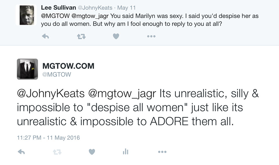 The entire “hate (all) women” crap is the dumbest s~~~ anywhere, so don’t get suckered into defending or explaining. As soon as you put it to those idiots like this, they realize just how f~~~ing stupid they sound and don’t have a WORD to say back. They just slither away to reevaluate.