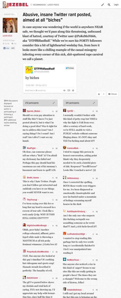 Fresh air is misogynist.You could even tweet “hy biches” (without even spelling it properly) and Jezebels will lose their s~~~. “Fresh air is misogyny” is not too far from the truth. So much for “strong and independent”. How the f~~~ do they survive in the real world? Turn off the internet ladies, you’re clearly not ready for it. It’s for men only — just like everything else. The reason you belong in the kitchen is because you don’t even feel safe from a TWEET.