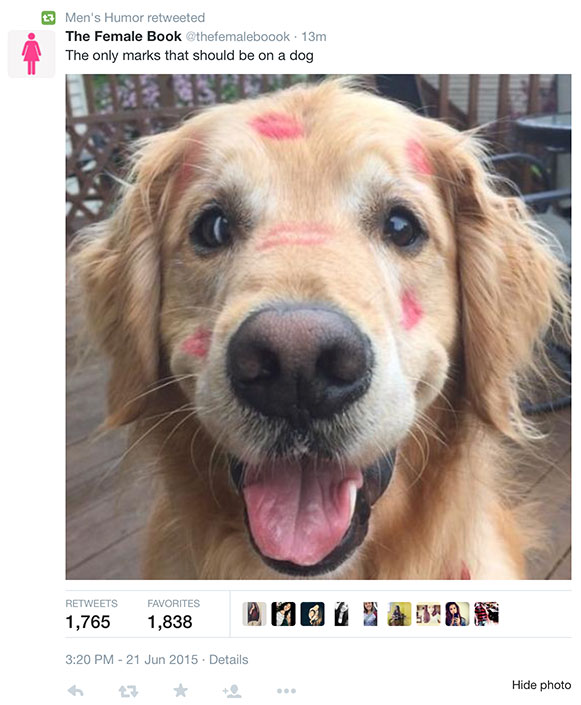 “the only marks that should be on a dog”.Does that “female book” post a picture of a MAN wth lipstick all over his face? Do they think “the only marks that should be on a MAN” is affectionate lipstick marks?