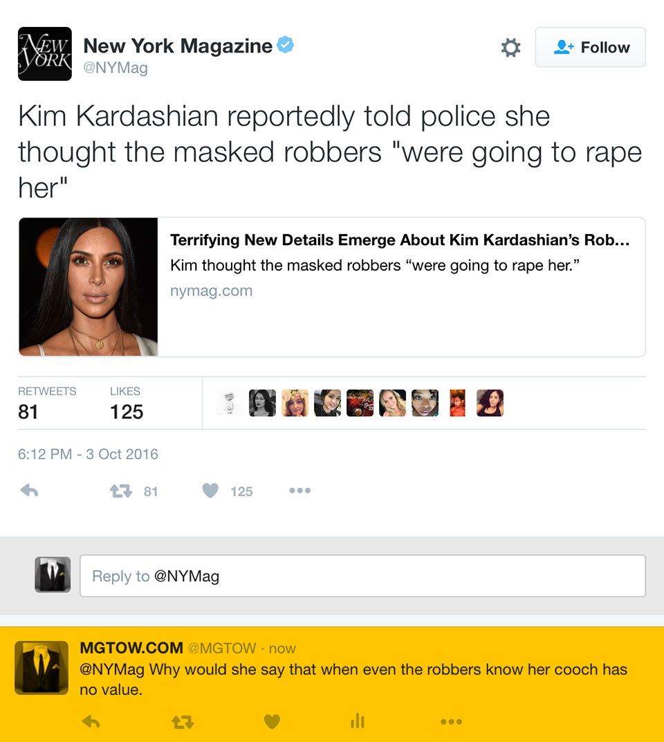 Christ, even Kim Kardashian said she “feared rape” during that robbery incident in Paris. But clearly the robbers who actually tied her up and taped her mouth shut weren’t even interested in her f~~~ing dumb cooch.