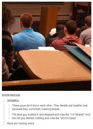 Just shows it does not take much for males who do not know each other to bond, which confuses females. Instead of sharing a drink or two, they are sharing stripes.