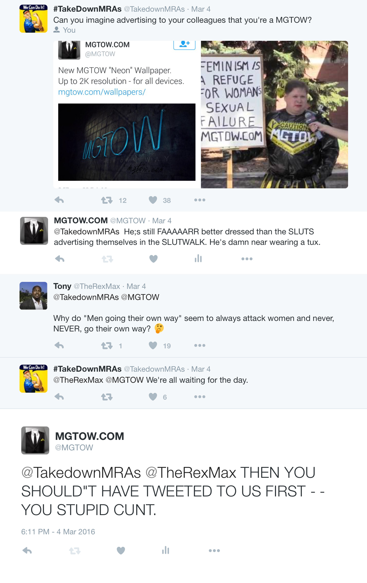 2 days ago, a fleet of bitches hammered our twitter – FIRST. Like 5 or 6 of them all at once. One of them called herself “TakeDownMRAs” and tried to troll us until they got their asses handed to them and ran off crying.