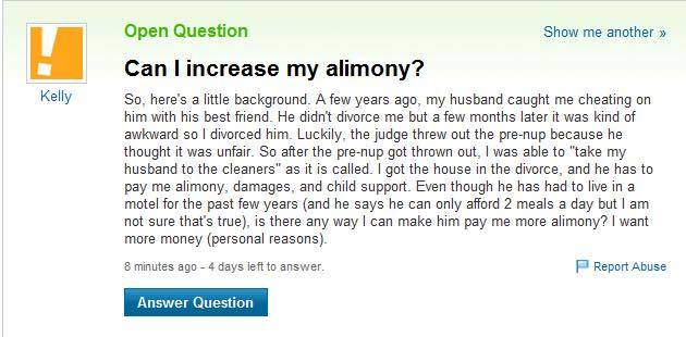 That’s a violation of a Man’s terms of service – to have his legal prenuptual agreement thrown out as worthless by a court of law. But his greedy ex-wife is permitted to shamelessly seek advice on how to extort more money from him years after the fact? Comment under that as a man in the way she deserves, and watch what happens. You would have received a dozen thumbs down and a warning letter in your email box about how you “violated” Yahoo’s terms of service. But not anymore.