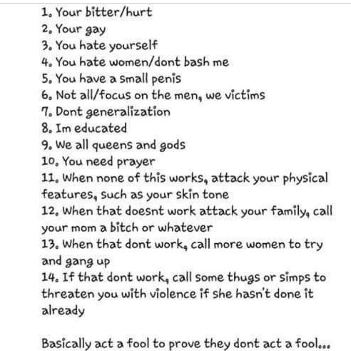 It might be helpful to categorize the major shaming tactics that are hurled against men whenever a discussion arises about the very real actions and behavior of the female collective. The following list contains descriptions of shaming tactics and the most common deflections.