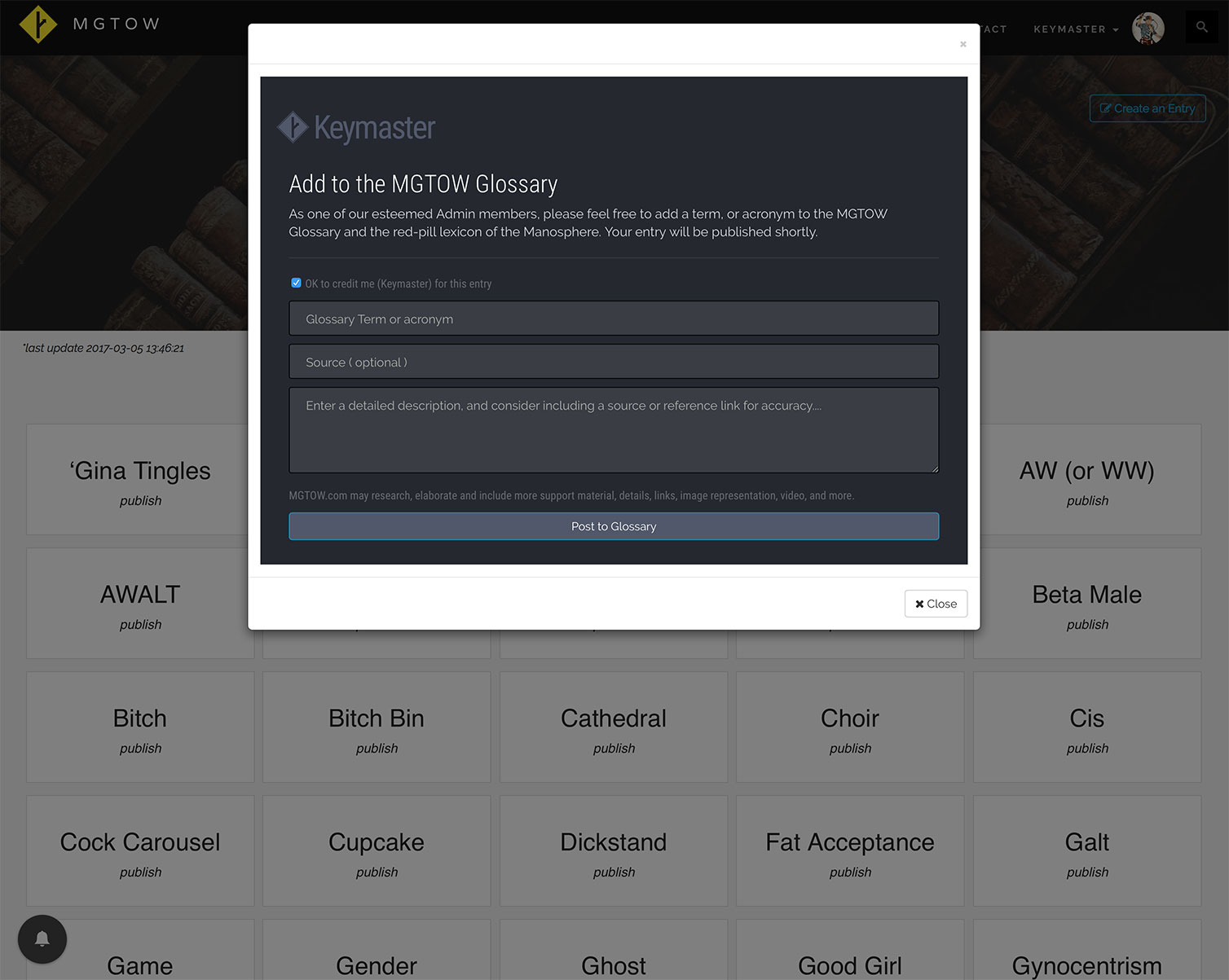 We have created the ability for YOU to contribute to it with suggestions. A long time in the making, this allows members to grow sections of the site. ( Glossary terms, videos, audios, and even write posts for the site’s front end ). We created a cool submission modal ( not visible yet while we are testing ) where established members can “create an entry”. Would love to have that live by this evening. If not, in the next couple of days as time permits.